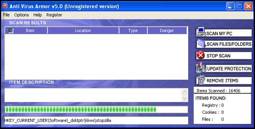Anti Virus Armor (also referred to as Anti-Virus Armor 2010) is a rogue anti-spyware application designed to pilfer money from helpless computer users. Once active on the infected computer, Anti Virus Armor pretends to scan your system and reports some imaginary threats. In order to better convince you, Anti Virus Armor repeatedly displays false popup alerts and floods your desktop with fake scan reports telling you that your system is at risk and you need to the licensed copy of Anti Virus Armor for removal assistance. When running, Anti Virus Armor will eat up the processing resources of your computer so as to make your computer fail to cope with the usual tasks. Do not become another victim of Anti Virus Armor by paying for this blatant scam. Anti Virus Armor removal guide is right below.